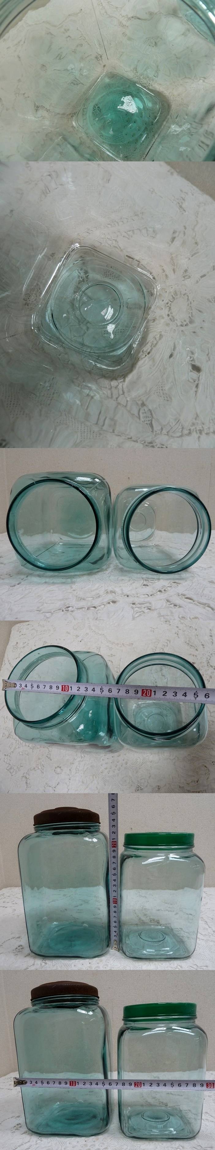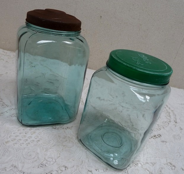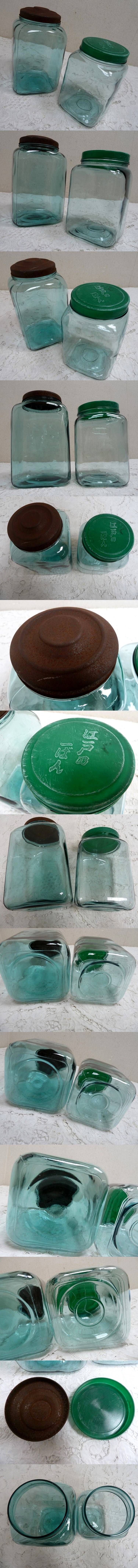 - (☆BM)昭和レトロ 懐かしい ガラス 保存瓶 大型 2点 角型 グリーン 江戸乃一ばん アンティーク 懐かしい 海苔 ボトル 空瓶 菓子瓶 駄菓子