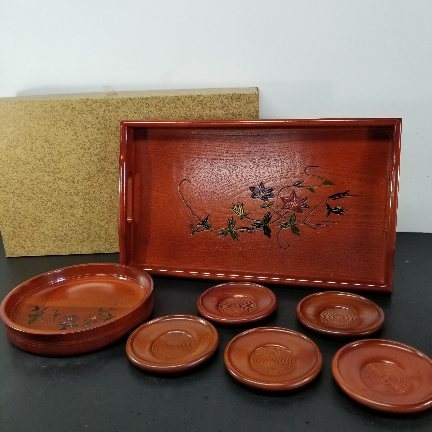 - キッチン用品 お盆 トレー 長手盆 菓子鉢 茶托5枚セット 木製漆器 A9632A10