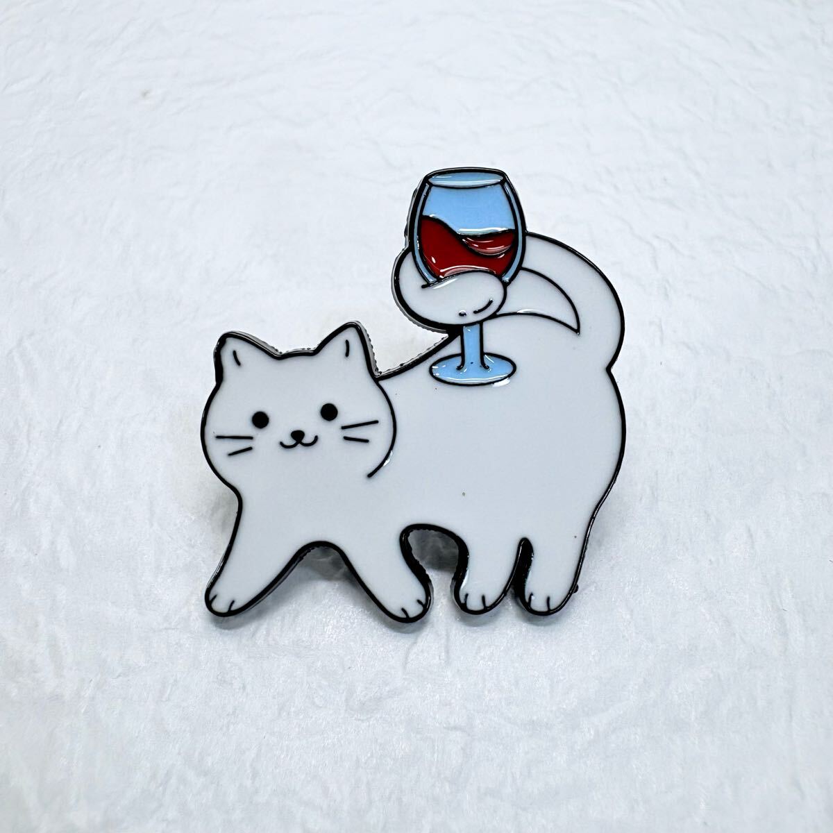 - 【ピンバッジ】ワインをしっぽで掴む白猫さん