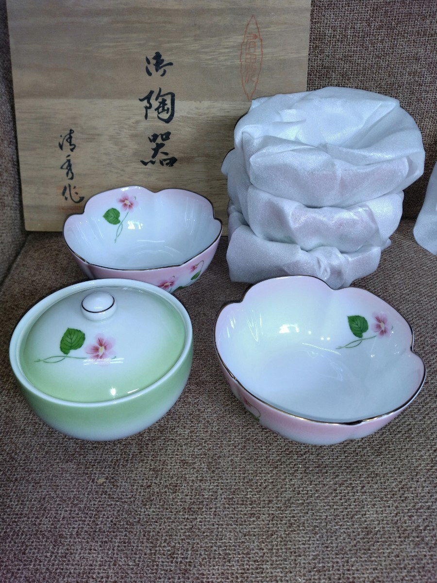- K430 有田焼 小鉢 花柄 『清秀』 蓋物付小鉢揃 小皿 深鉢 煮物皿 銘々皿 金縁 和風 和食器 小花柄 すみれ 木箱