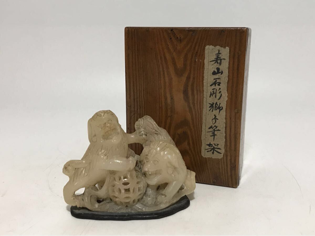 - 中国美術 寿山石彫獅子形筆置 置物 細密細工 唐物 唐木台付