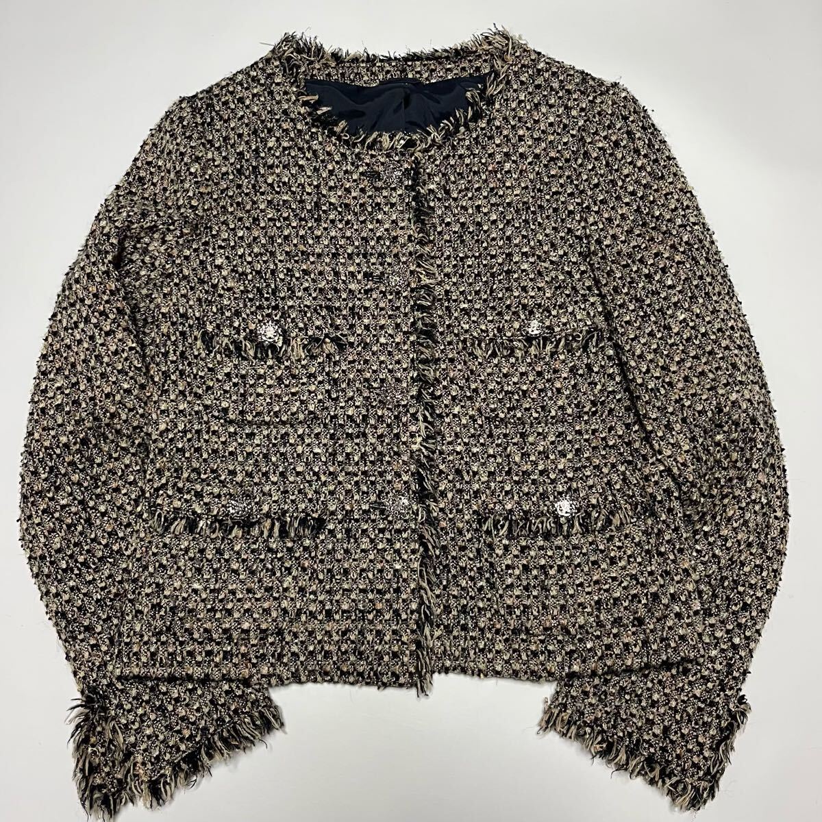 > 【エレガント/上品ツイード】アナイ ANAYI エンブレムボタン ラメ糸 フリンジ ツイードジャケット ノーカラージャケット 38サイズ