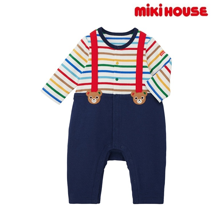 > 即決です!【ミキハウス】新品未使用♪mikihouse 80cm 75cm~85cm カバーオール ベビー キッズ ボーダー サスペンダー ロンパース 男の子 紺