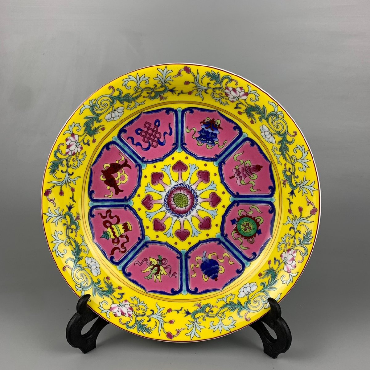 - 超美品! お皿 観賞皿 黄地八宝図 スタンド付き 観賞 装飾 置物 賞物 景徳鎮 中国陶磁 中国美術 fgcq014