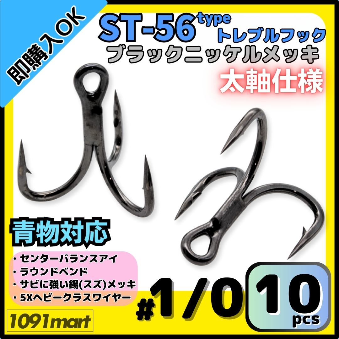 > 【送料無料】ST-56タイプ 防錆トレブルフック #1/0 ブラック 10本セット 太軸 5Xワイヤー使用 大物 青物対応 ヘビークラストリプルフック