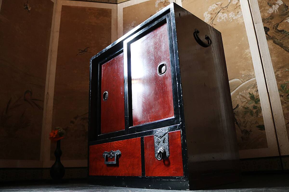 > 【伊董】C133.アンティーク!サイズ良!美品!古い時代箪笥山形県庄内地方角金具帳場箪笥欅明治初期戸棚茶箪笥飾り棚 #古民芸 #和モダン
