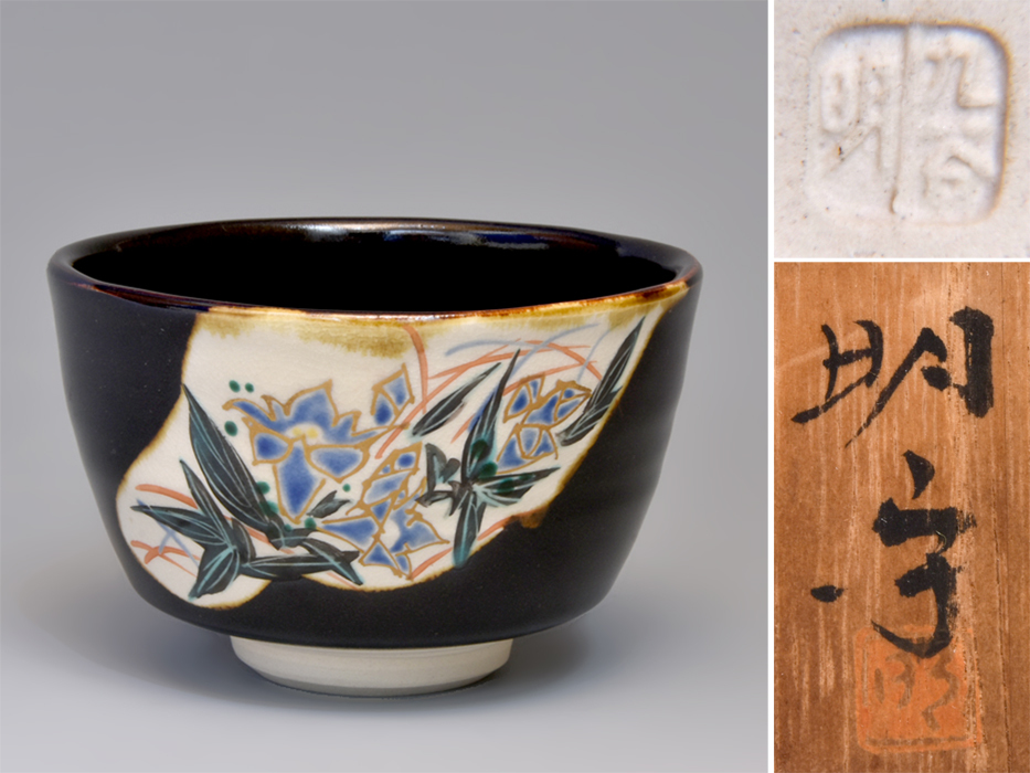> 九谷 中田明守(造)金彩色絵竜胆文茶碗 共箱 共布 九谷焼 茶道具 現代工芸 美品 b9879o
