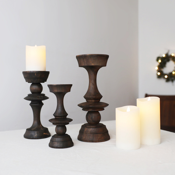 - 送料無料 3点セット アンティーク加工 天然無垢ウッド キャンドルスタンド オブジェ 飾台 ウッドターニングW36◎