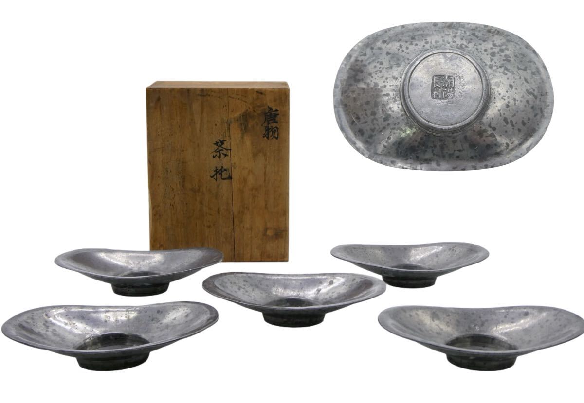 - GY 時代物 唐物 古錫 斑錫 茶托 5客 共箱 潮陽長利在銘 710g 煎茶道具