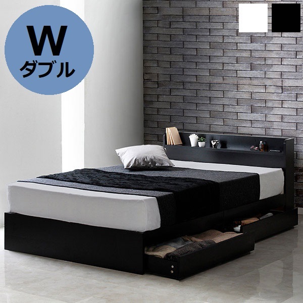 > 【新品】◆ダブルベッド ブラック 引き出し USBコンセント 宮付き 北欧 RUES【ルース】棚・コンセント付き収納ベッド