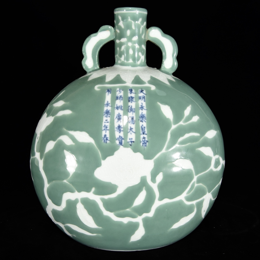 - 『館蔵珍品 明 永樂年製款 古陶瓷品 綠釉 留白花卉紋 如意耳抱月瓶 陶芸』稀少珍蔵品 古賞物 貴重物品 収蔵品 中国古美術 時代物 古董品