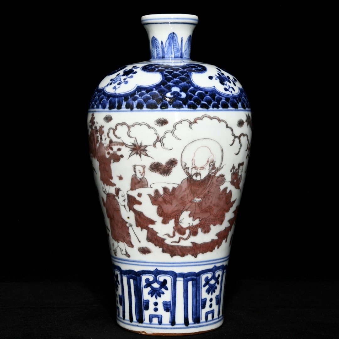 > 多宝閣 ■ 0173UL.9中国磁器 中国骨董【明嘉靖青白釉赤人物文梅花瓶】工芸品 施釉陶 陶芸 置物 收藏品 孤品