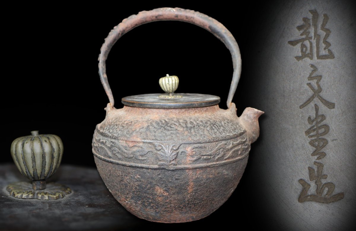 - 【江】釜師名人 龍文堂造 荒肌雷唐草文花形摘姥口鉄瓶 高さ21㎝ 古美術品(茶道具茶器薬缶湯沸)X1802 CTDBrjaa