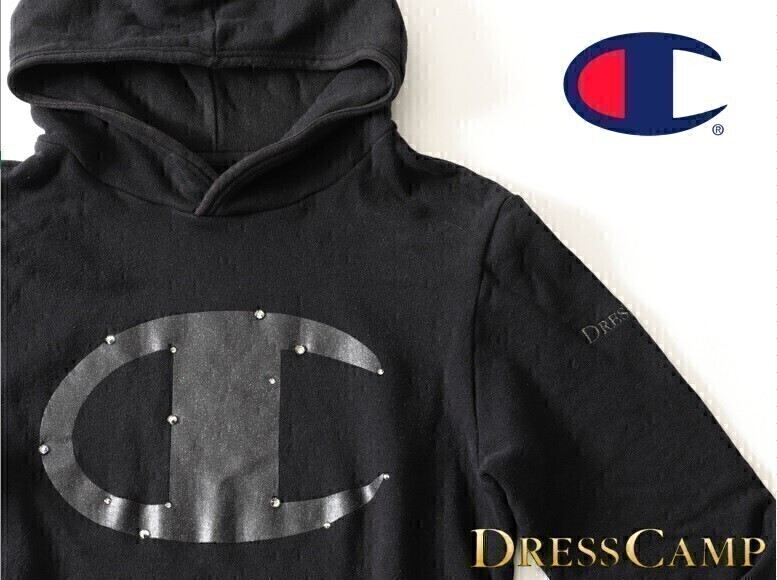 > 美品 DRESS CAMP ドレスキャンプ別注 Championチャンピオン★クリスタルビッグロゴプルオーバーフーディー Size46 M【C-200912】ブラック黒