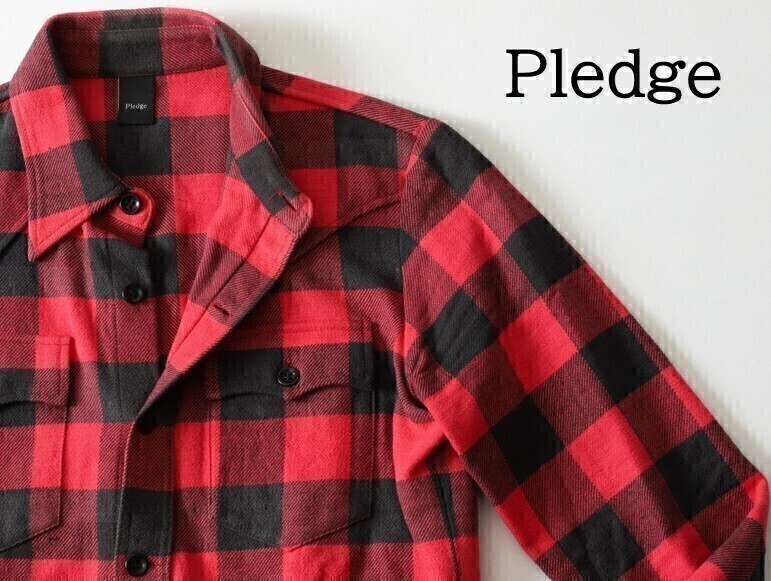 > ★傑作品★Pledge プレッジ★格子柄メンズ長袖ネルシャツ★48【正規品】レッド 赤黒【本物保証】超細身シルエット タイトデザイン 廃盤
