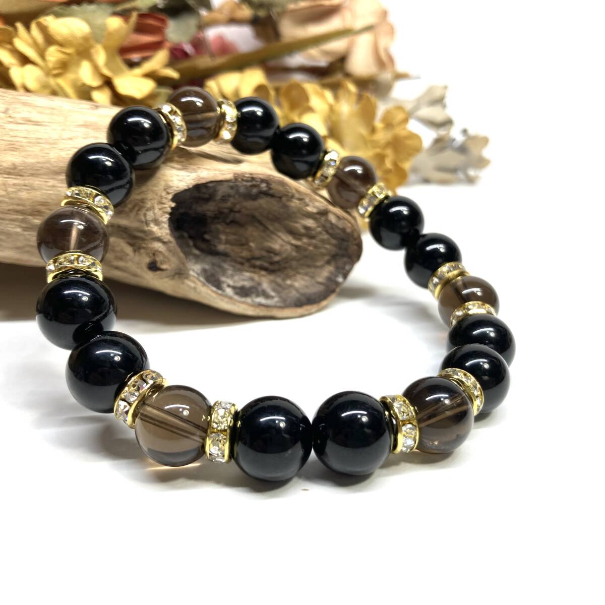 > モリオン&スモーキークォーツ パワーストーン ブレスレット 天然石ブレス (ゴールド) 10mm メンズ・レディース 厄除け 癒し ☆
