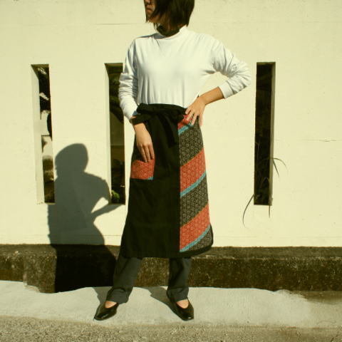 - 着物素材使用1600円紺地に麻の葉文ポケット付きロングエプロン