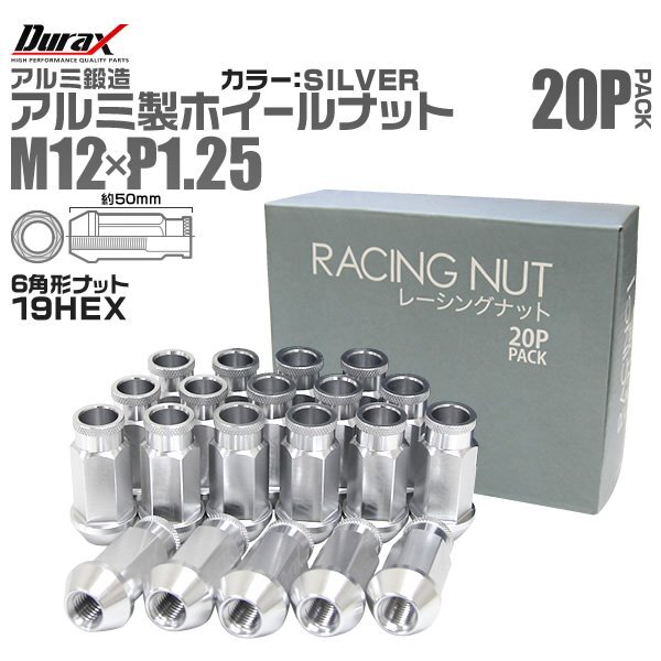 > Durax レーシングナット ラグナット ホイール M12 P1.25 ホイールナット 貫通 50mm 銀 20個 アルミ ホイール ナット日産 スバル スズキ
