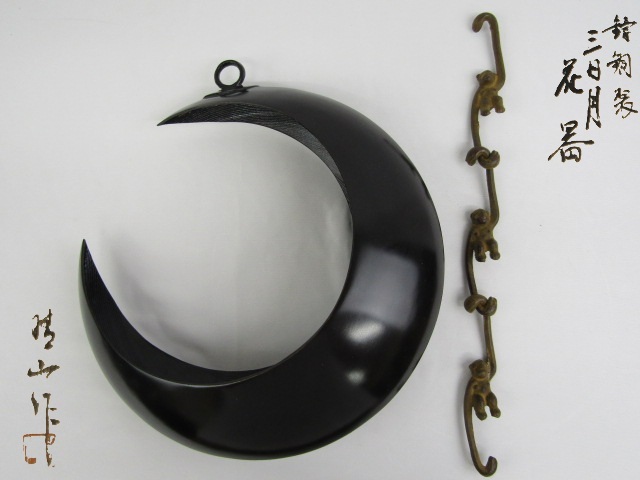 - 【Y】◇伝統工芸 高岡銅器 鋳銅製 吊花生 三日月 尺0 高さ33cm 三猿吊金具付 Y5-0926◇