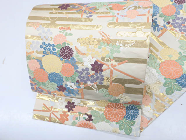 > 《京都一輝堂》リサイクル着物 袋帯 六通 金糸 菊文 正絹 25b06-1073