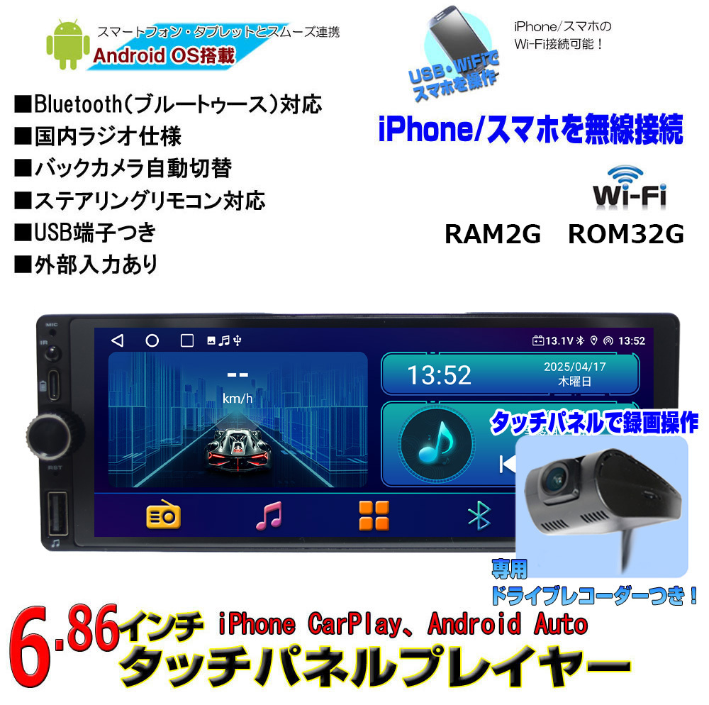 - 1DIN6.86インチタッチパネルプレイヤー+ドライブレコーダーセットAndroid搭載CarPlayAndroidautoラジオUSBBluetoothRAM2GB+ROM32GB