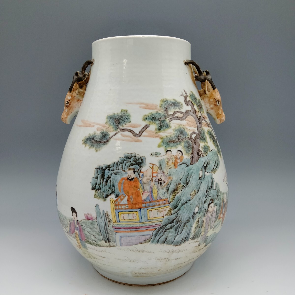 - 中国美術 大清乾隆年製銘 粉彩人物紋鹿耳大花瓶 唐物 壺 時代物