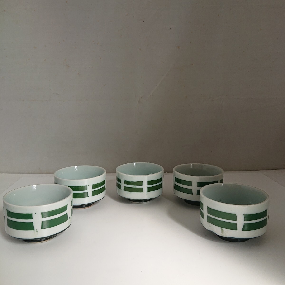 - 【茶器まとめ売り】湯呑み5客 箱無し 陶磁器 緑縞模様煎茶道具 当時物 現状品 ぷらみ 1001 03
