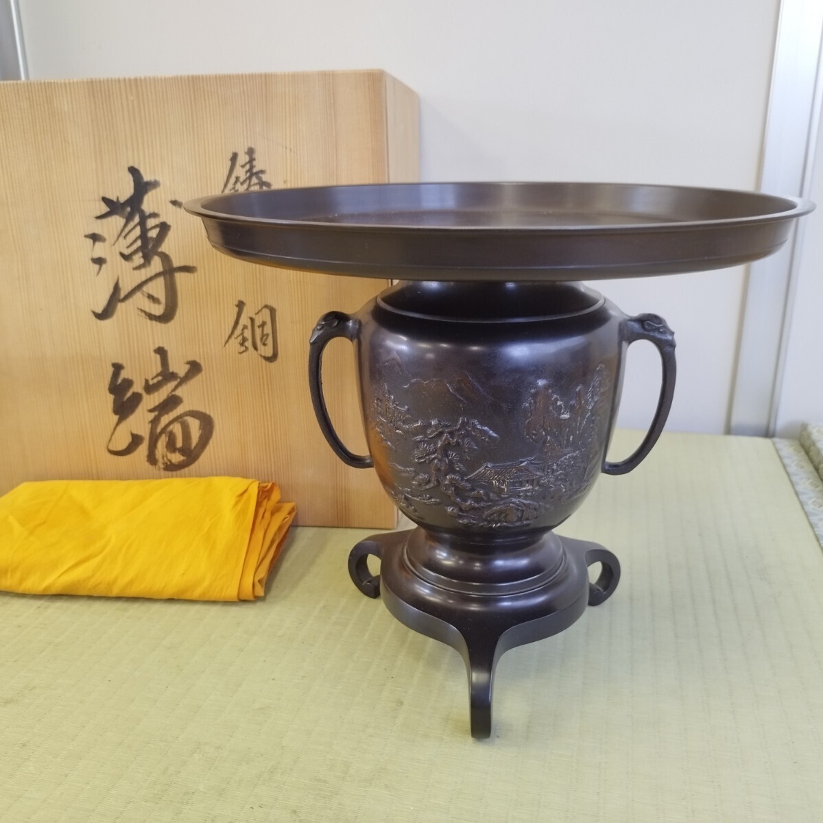 - 戸06d 薄端 花器 うすばた 三足 生け花 花瓶 鋳銅 銅器 唐銅 山水風景図 花生け 花入 華道 工芸品 茶道具 茶道 フラワーベース 蔵出し