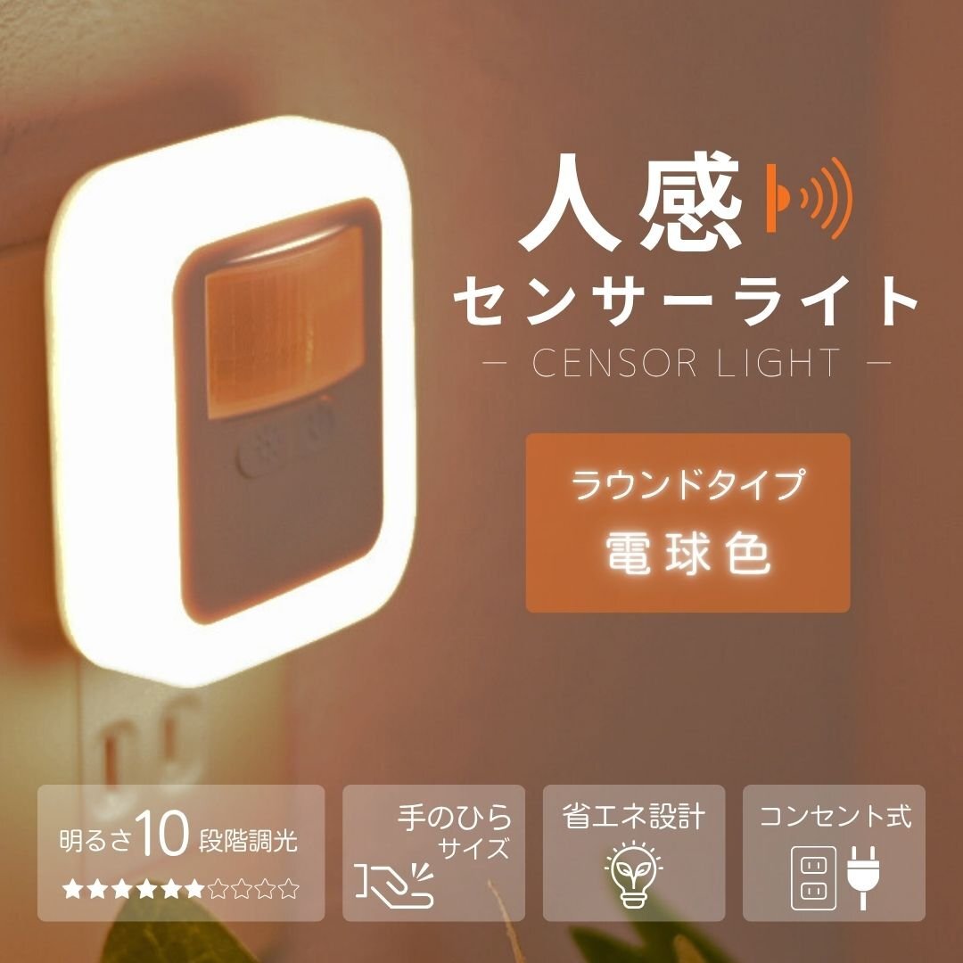 - 【ラウンドタイプ/電球色】人感センサーライト コンセント式 センサーライト 室内 フットライト 足元灯 屋内 人感センサー 調光 省エネ