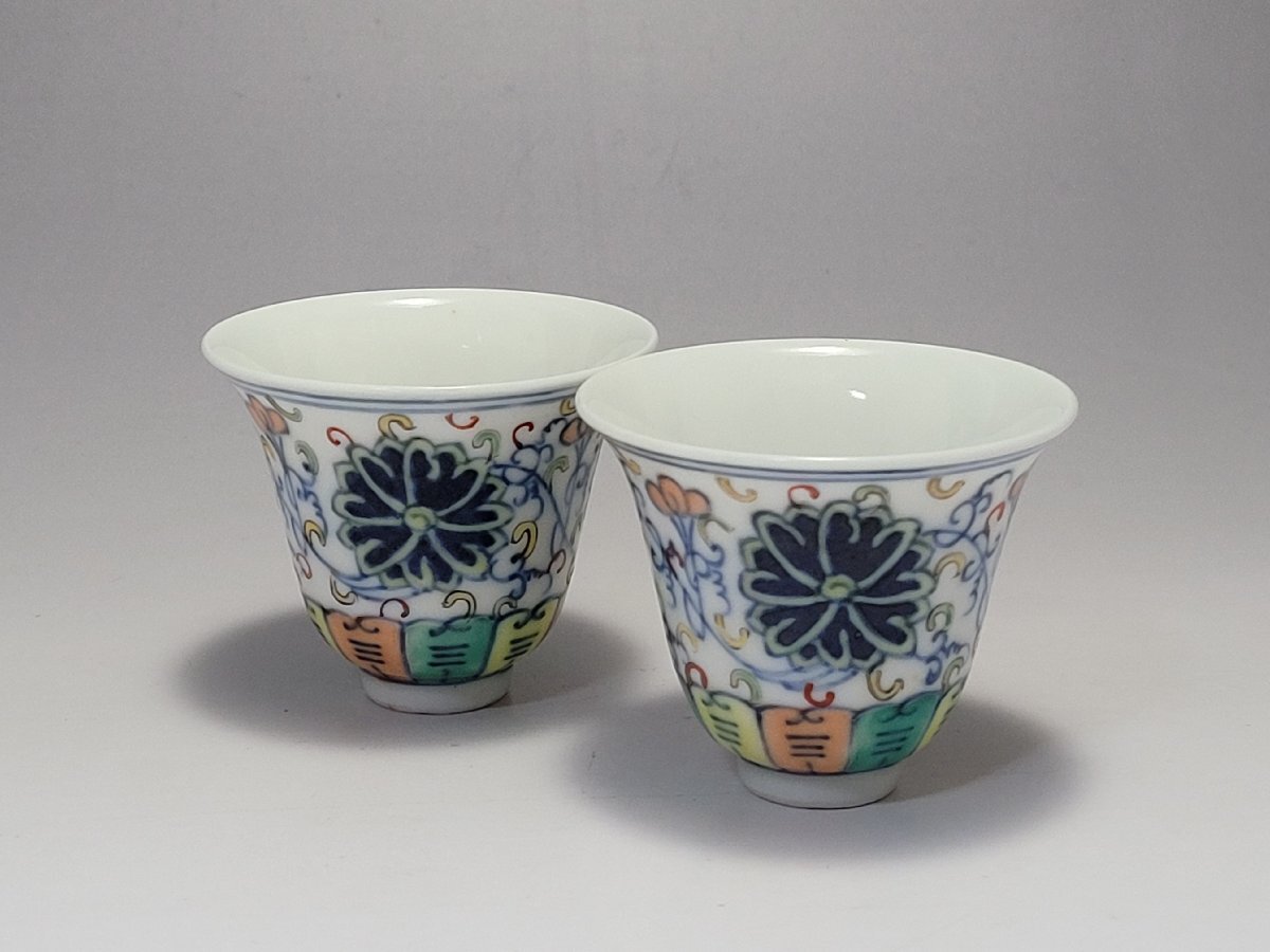 > L 染付色絵 花紋 茶杯 二客「玉」在銘 時代唐物 幅約5.8cm / 明清時代 盃 小碗 杯 盞 小鉢 茶道具 煎茶道具 酒器 人間国宝 李朝 高麗 古董