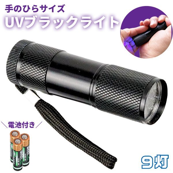 > UV ブラックライト 9灯 LED 紫外線ライト 電池付き 395nm レジン 硬化 ライト 懐中電灯 ネイル硬化 汚れ 傷 アニサキス 宝石鑑定 ハンディ