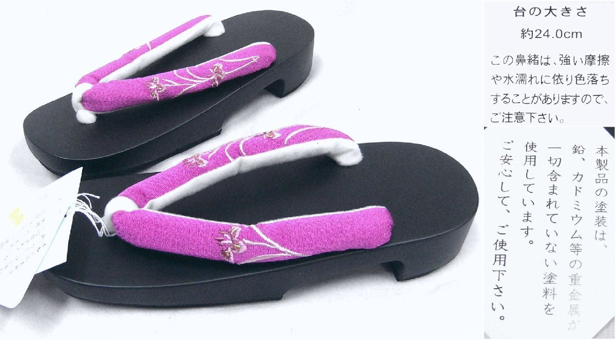 > アウトレット 23㎝~24.5㎝の方に 黒色台の下駄 1003 梅紫系刺繍鼻緒 未使用・わけあり品