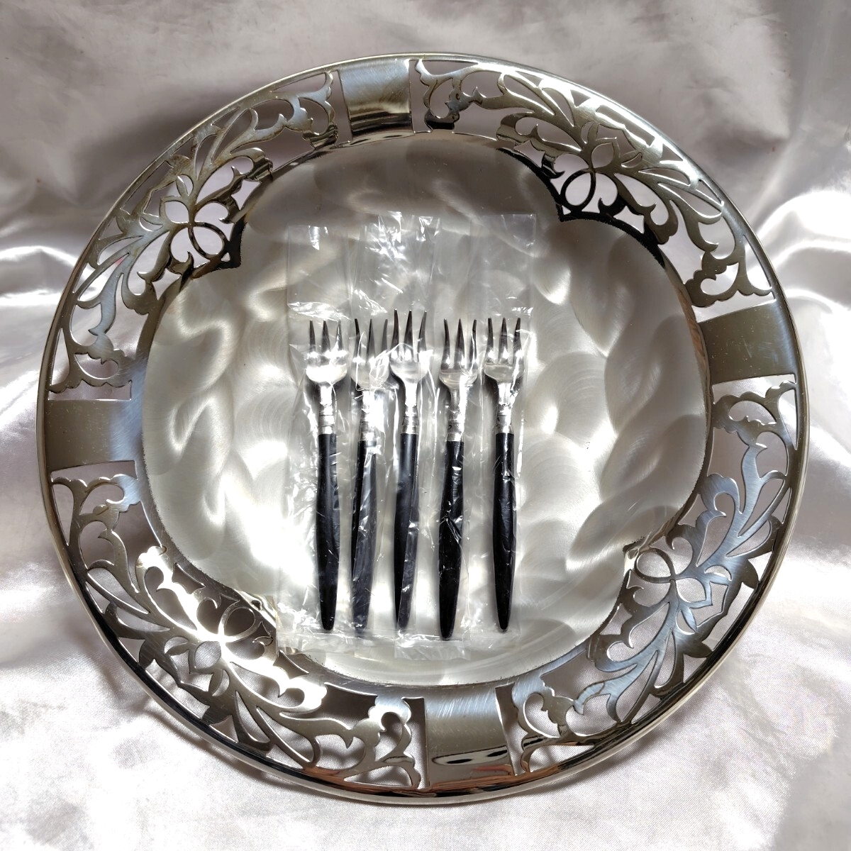 - 菓子皿&デザートフォーク5本セット HAND FINISHED シルバー色 プレート フルーツ皿 フォーク【雑貨0927】