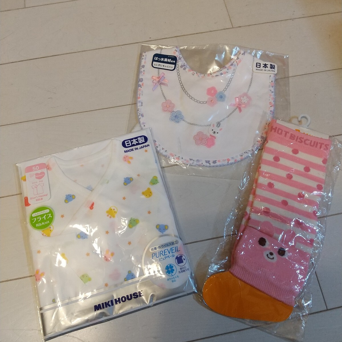 - 新品タグ付き未使用未開封 ミキハウスファースト ホットビスケッツ 出産準備3点セット 短肌着 うさぎだまし絵スタイ レッグウォーマー