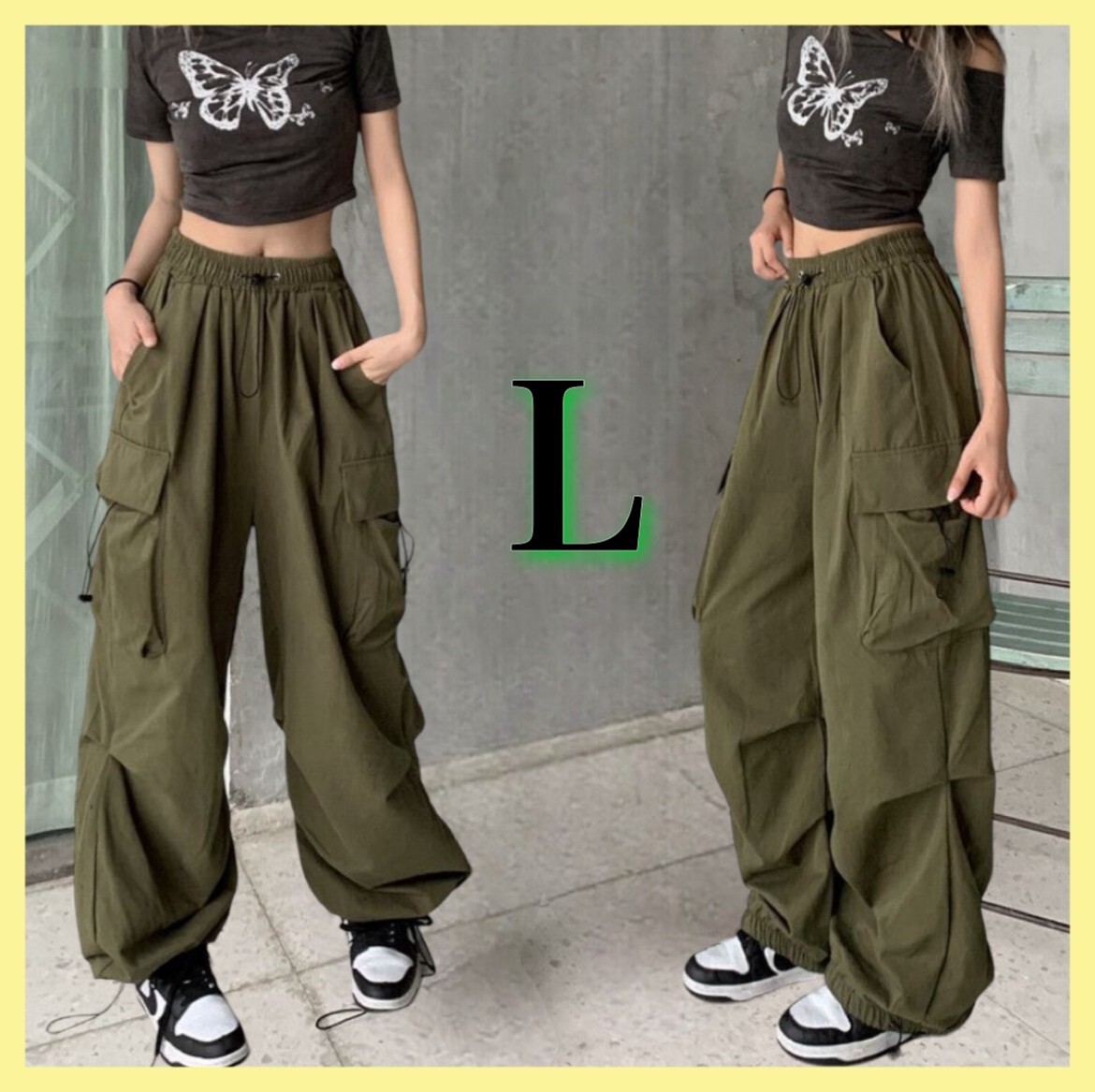 - パラシュートパンツ カーゴパンツ ワークパンツ カーキ L トレンド 人気 レディース ストリート ダンス 裾絞り