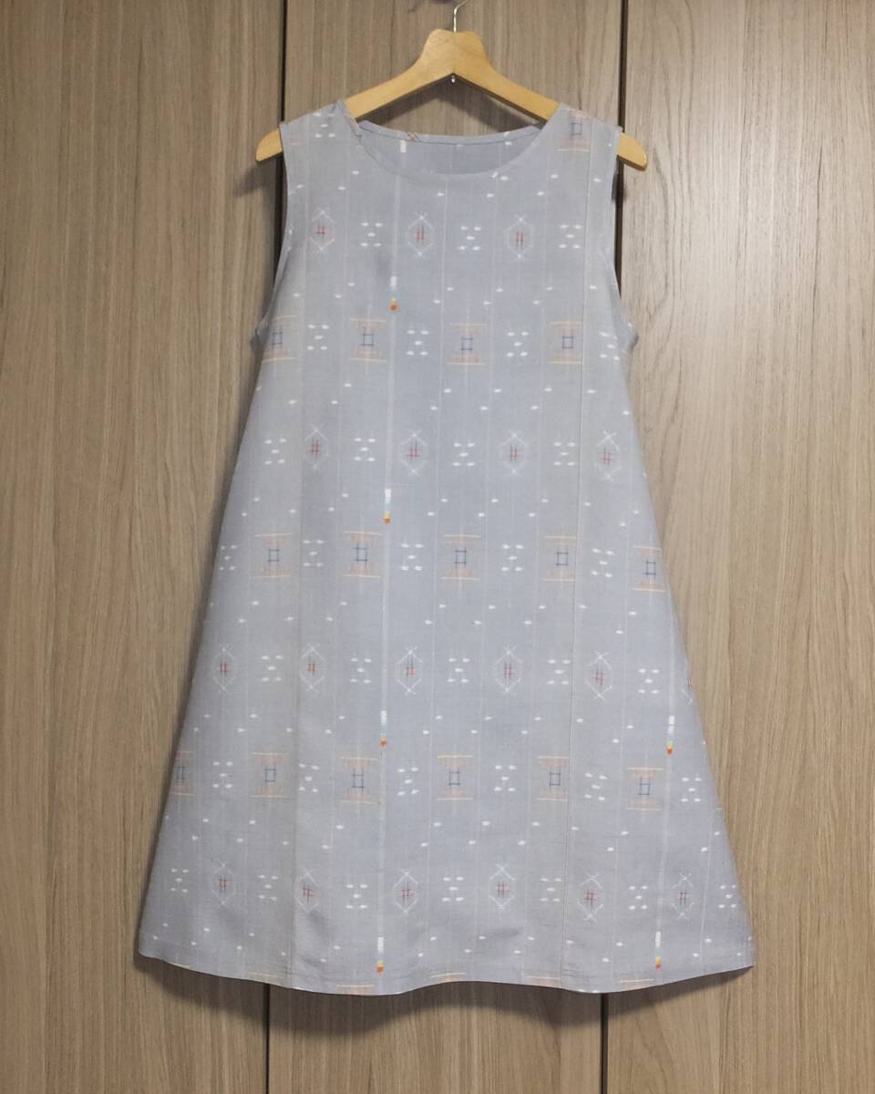 - ♪送料無料 ハンドメイド 着物リメイク 古布 正絹 草戸紬 草木染 縦縞・幾何学模様 ノースリーブワンピース♪