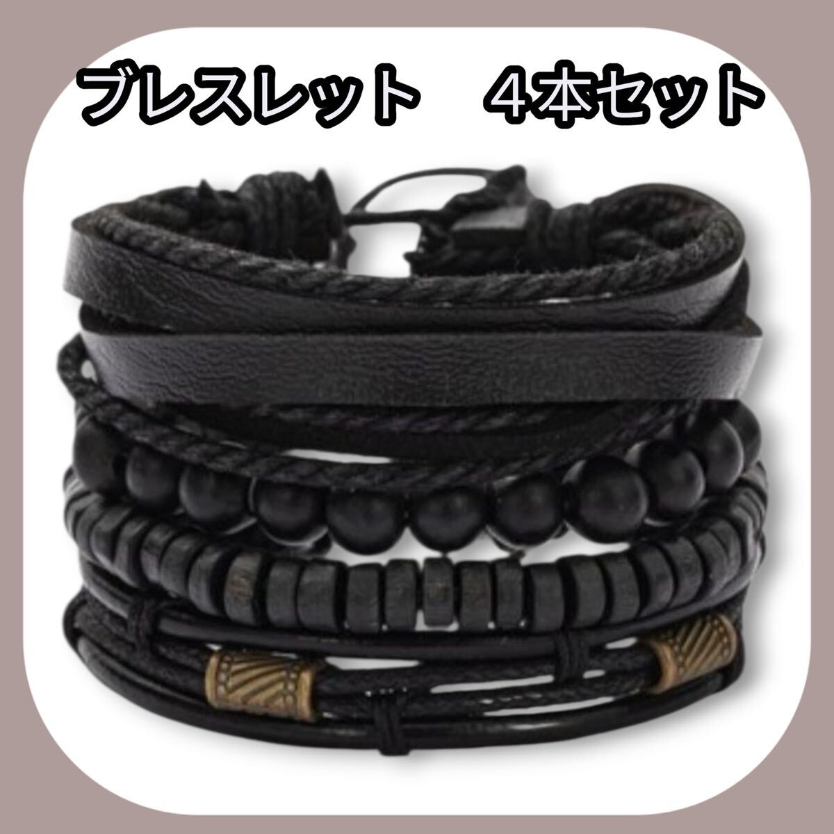 - ブレスレット 4本セット PVレザー 木製ビーズ アメカジ ユニセックス 黒 ブラック