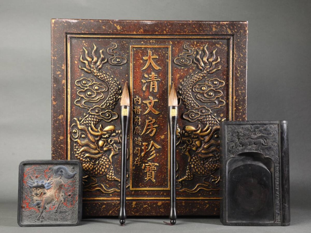 - ▽鴻▽清朝時代 端硯 麒麟紋端渓硯 油煙墨 毛筆セット 箱付き 唐硯 墨寶 書道具 時代物 中国古美術 骨董品