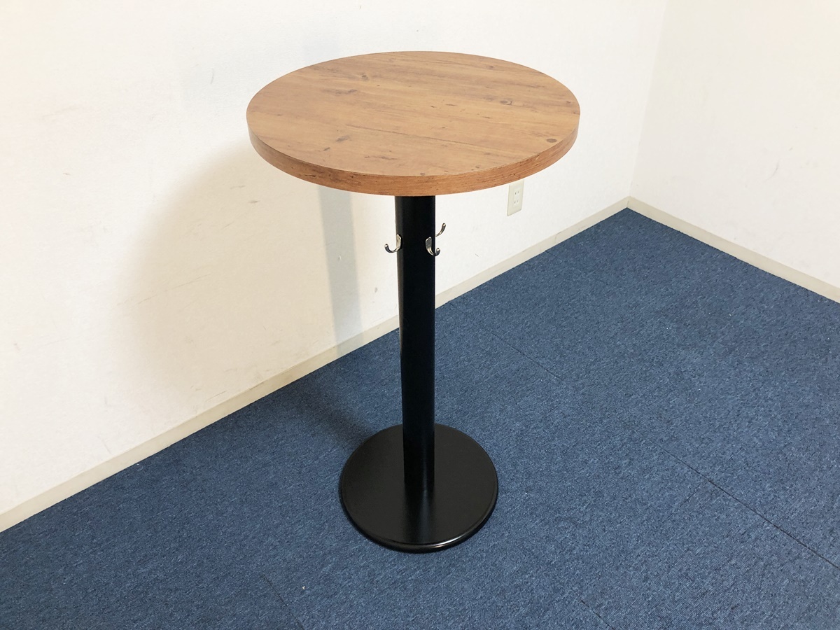> ハイタイプ丸テーブル 多目的ディスプレイテーブル美品 4ヶ所フック・脚部底アジャスター付 ウォルナット色(木目) 丸型カウンターテーブル