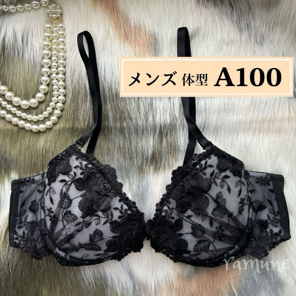 - 【メンズ A100 黒】新品 男性用ブラジャー チュール 刺繍 メンズ体型 取り外せるパッド付き メンズブラ 下着 アンダー大きめ 男性向け