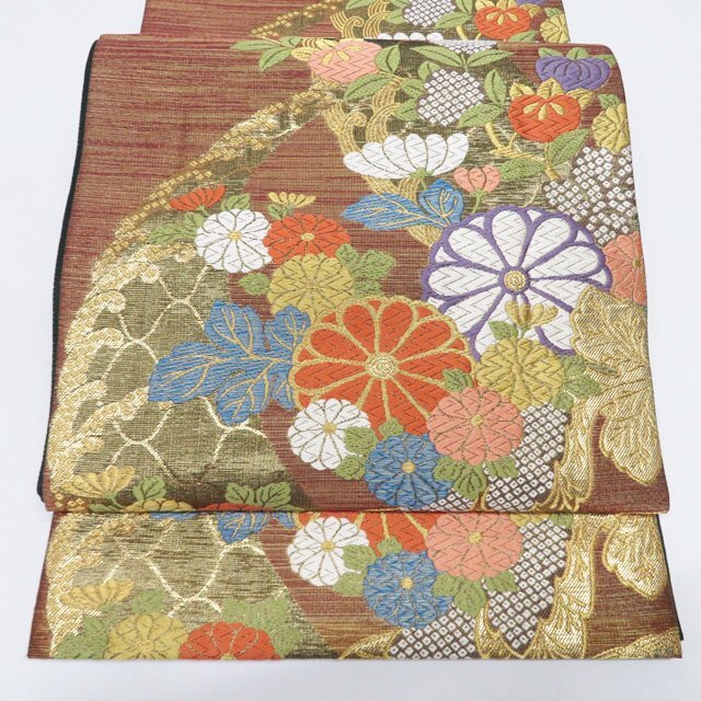 > ★きもの北條★ 花模様 菊 橘 箔糸 六通 仕立て上がり 中古 正絹 袋帯 T800-6