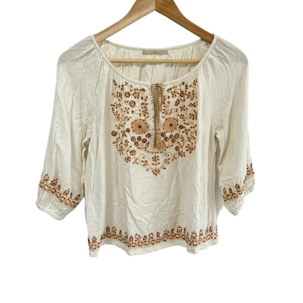 > ヌキテパ NE QUITTEZ PAS 七分袖カットソー - アイボリー×ピンクベージュ×ブロンズ レディース クルーネック/刺繍/ビーズ/フラワー(花)
