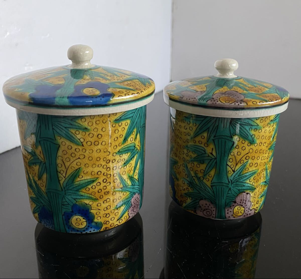 > 新品未使用品◆九谷焼 仙谷 夫婦湯呑み 蓋付き湯呑み ペア 五彩 竹・花