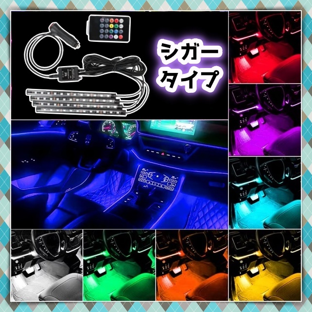 - LED フロアライト 4本 音楽連動 シガーソケット スイッチ リモコン 車内 足元 装飾 12V LEDテープ ムード イルミ 電装 パーツ 汎用