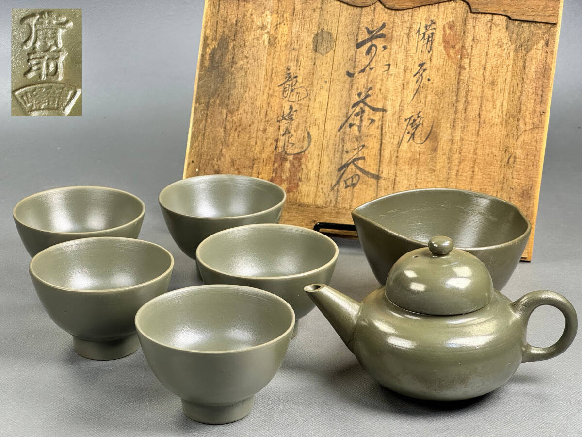 > 【偲】名工 藤田龍峰 青備前 煎茶器(後手急須、湯冷まし、煎茶碗5客) 共箱有 煎茶道具 在銘 華道 茶道 m-107