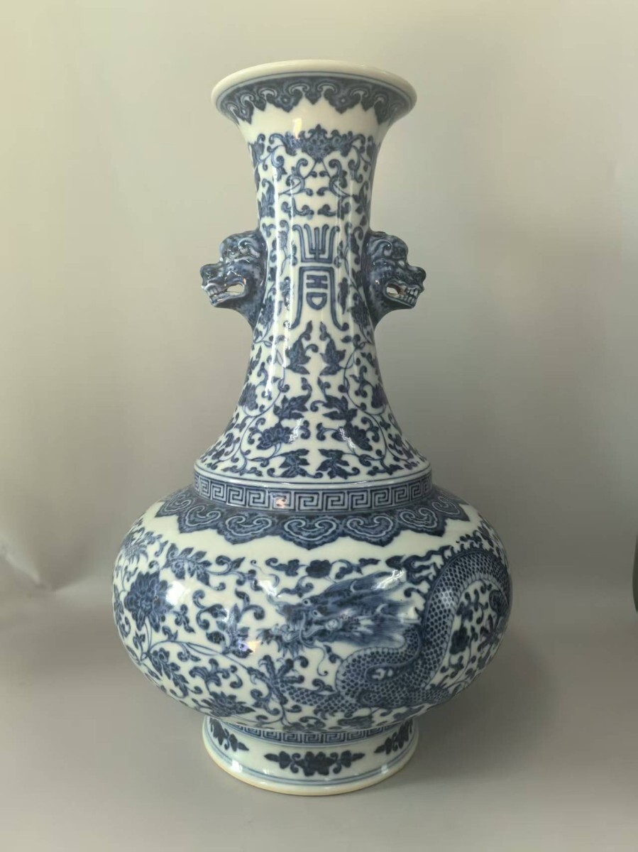 - 【積古】中国古美術 清時代 乾隆 青花 獣首 花瓶 古玩 骨董 美術品 骨董品 時代物 古美術 唐物 当時物 置物 js45