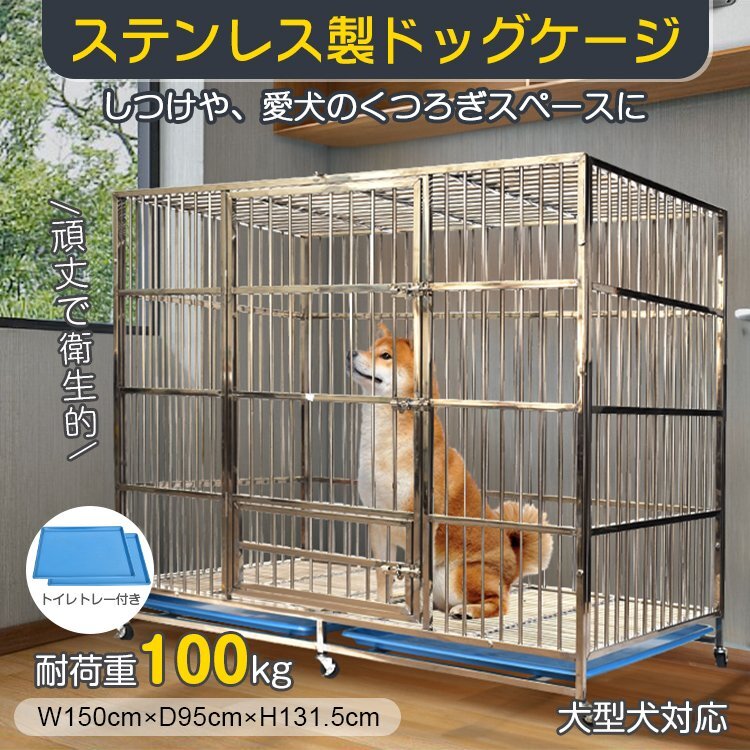 - 送料無料 犬用ケージ 大型犬 ケージ 犬小屋 頑丈 ゲージ 犬用ケージ 屋根付き キャスター付き ステンレス トレー 脱走防止 pt088h-150-sil