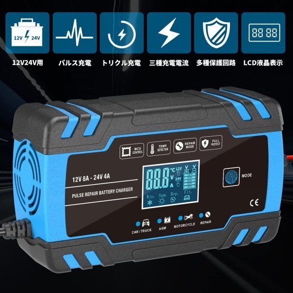 - AUTOWHD 12V 24V用鉛蓄バッテリー充電器 全自動 修復充電機 1.5A 4A 8A LCD表示 自動車 バイク トラック等適用 AF674