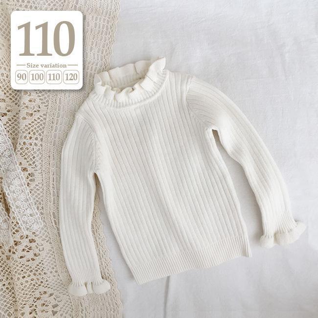 - 新品未使用 110cm ホワイト〔#BMフリルハイネックリブニット〕タートルネック ハイネック 長袖 トップス シンプル ベベ 子供 女の子 秋冬白