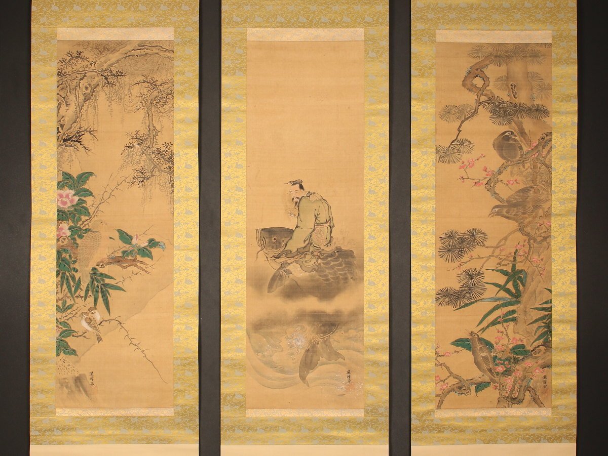- 【模写】【伝来】am7293〈加藤遠澤〉三幅対 花鳥・鯉仙人図 会津藩御用絵師 狩野派 狩野探幽門下四天王 琴高仙人 周代の仙人 中国